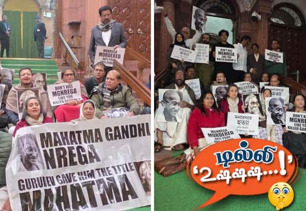 மஹாத்மா காந்தி தேசிய ஊரக வேலைவாய்ப்பு உறுதி சட்டத்திற்கு மாற்றாக கொண்டு வரப்பட்ட, 'விக்சித் பாரத் ஜி ராம் ஜி' என்ற மசோதா பார்லி.,யில் நிறைவேற்றப்பட்டது. 'காந்தி பெயரை மாற்றுவதா?' என, 'இண்டி' கூட்டணி கொதித்து எழுந்தது. பார்லி., வளாகத்தில் இரண்டு நாட்கள் போராட்டம் என, மேற்கு வங்க முதல்வர் மம்தா பானர்ஜியின் திரிணமுல் காங்., அறிவித்தது. இதில், எதிர்க்கட்சிகள் பங்கேற்கும் என, அறிவிக்கப்பட்டது.