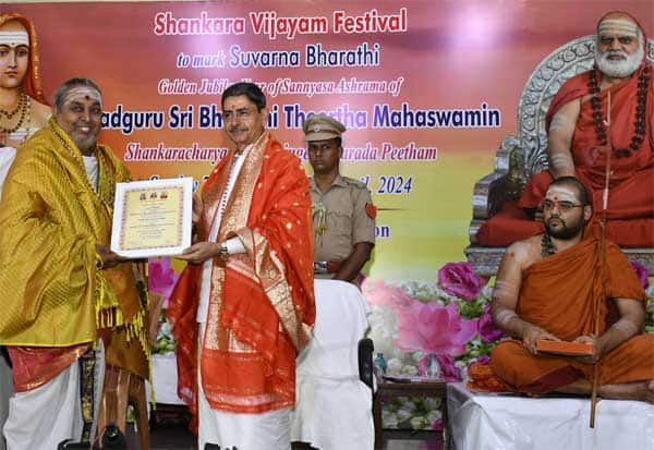சிருங்கேரி சாரதா பீடாதிபதி பாரதீ தீர்த்த மகா சுவாமிகளின் சன்யாச ஆஸ்ரம பொன்விழாவை முன்னிட்டு, சென்னை அடையாறு அனந்த பத்மநாப சுவாமி கோயில் அருகில் உள்ள கல்யாண மண்டபத்தில், ஏழு நாட்கள் சங்கர விஜயம் திருவிழா நடத்தப்படுகிறது. இன்று(ஏப்ரல் 13) தமிழக கவர்னர் ஆர்.என்.ரவி, பங்கேற்று வித்யா பாரதி புரஸ்கார் விருதுகளை வழங்கினார்.