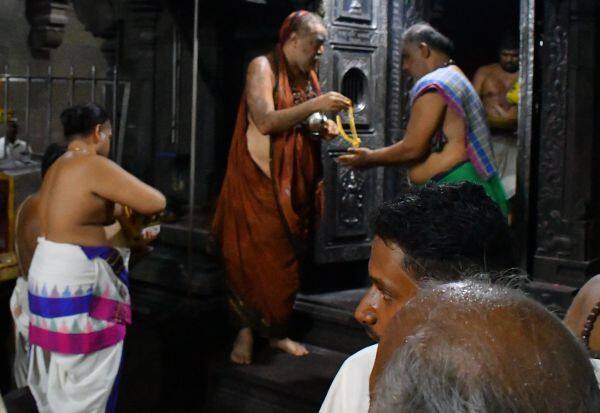 கடந்தாண்டு ஸ்ரீ விஜயேந்திர சரஸ்வதி சுவாமிகள் கருவறைக்குள் செல்ல சிலர் எதிர்ப்பு தெரிவித்தனர். இதனை தவிர்க்க நேற்று பணியில் உள்ள கோயில் குருக்கள் தவிர வேறு யாரையும் சன்னதியில் நிற்க அனுமதிக்கவில்லை.