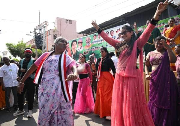 கோவை வி.கே.கே., மேனன் ரோட்டில் ரோடு ஷோ மேற்கொள்ள தமிழக முன்னாள் முதல்வர் பழனிசாமி வருவதையடுத்து அங்கு திரண்ட தொண்டர்களை உற்சாகப்படுத்திய நடன கலைஞர்கள்.