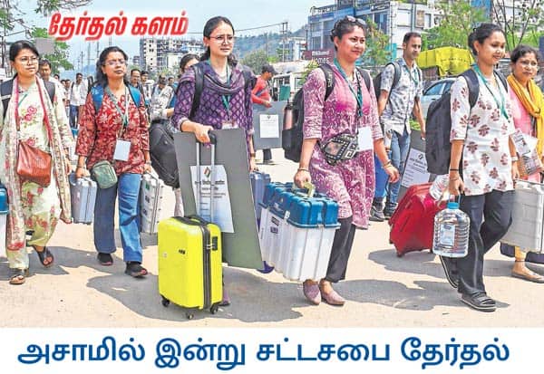 வடகிழக்கு மாநிலமான அசாமில் மொத்தமுள்ள 126 சட்டசபை தொகுதிகளுக்கு இன்று ஒரே கட்டமாக தேர்தல் நடக்கிறது. இதையொட்டி மின்னனு ஓட்டுப்பதிவு இயந்திரங்களுடன் தேர்தல் அதிகாரிகள். இடம்: குவஹாத்தி.