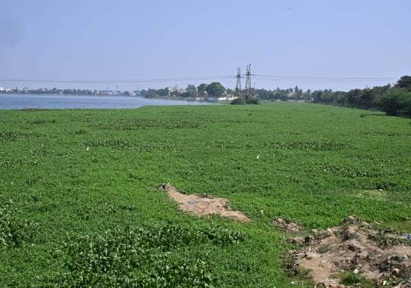 சென்னை கொரட்டூர் ஏரியில் அதிகளவில் கழிவுநீர் கலப்பதால், படர்ந்துள்ள ஆகாயத்தாமரை செடிகள்.