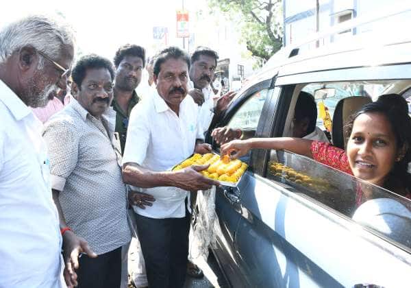 விழுப்புரம் காந்தி சிலை அருகே அ.தி.மு.க., வேட்பாளர் விஜயா அறிவித்ததை முன்னிட்டு தேசிய ஜனநாயக கூட்டணி கட்சியினர் பட்டாசு வெடித்து பொதுமக்களுக்கு இனிப்பு வழங்கினார்,